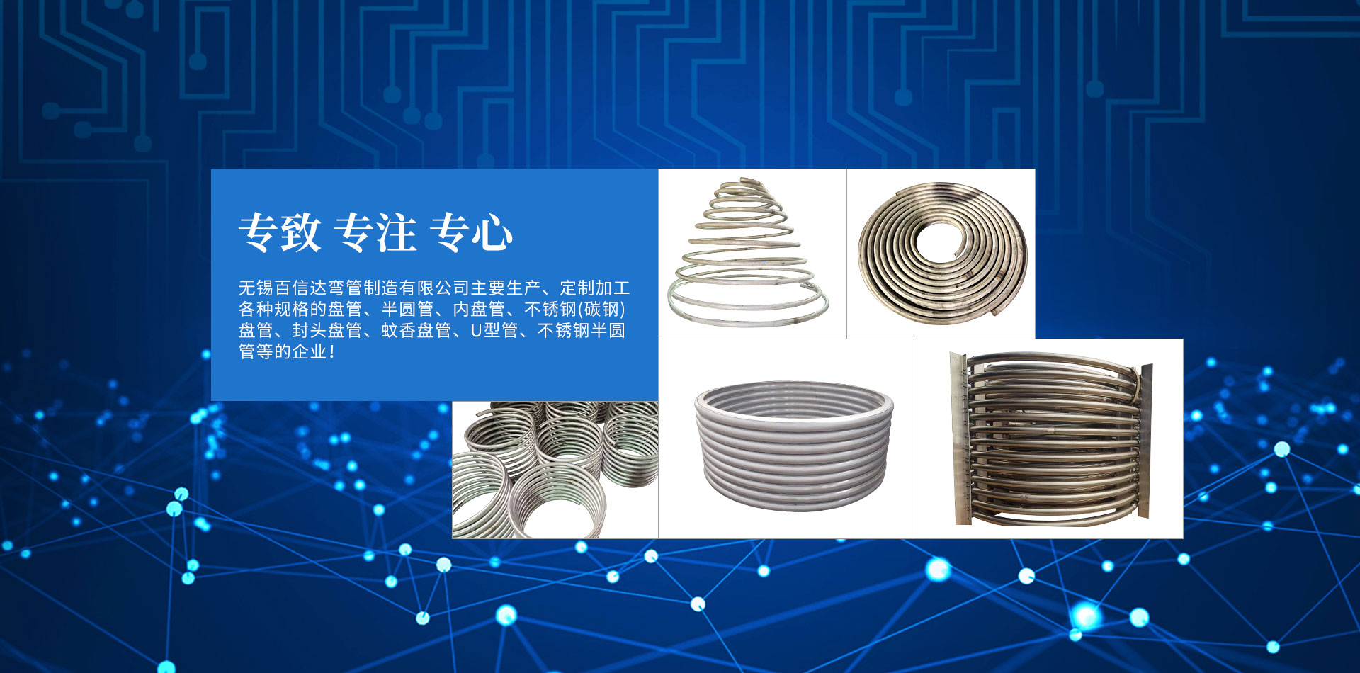 無(wú)錫百信達(dá)彎管制造有限公司位于經(jīng)濟(jì)發(fā)達(dá)、風(fēng)景秀麗的太湖之濱。本公司擁有完整、科學(xué)的質(zhì)量管理體系,公司的誠(chéng)信、實(shí)力和產(chǎn)品質(zhì)量獲得業(yè)界的認(rèn)可。公司專注生產(chǎn)、定制加工各種規(guī)格的盤管、半圓管、內(nèi)盤管、不銹鋼盤管、封頭盤管、蚊香盤管、U型管、不銹鋼半圓管、碳鋼盤管等的企業(yè)。本公司設(shè)計(jì)加工的彎管設(shè)備,質(zhì)量精良、結(jié)構(gòu)合理,效率高、操作簡(jiǎn)易、經(jīng)久耐用。公司已經(jīng)承接了各地多個(gè)大型場(chǎng)館工程項(xiàng)目的彎管加工,屢次得到了多家大客戶的好評(píng)。努力滿足客戶的需要,不斷提高自身水平是公司追求的目標(biāo)。歡迎社會(huì)各界朋友蒞臨無(wú)錫百信達(dá)彎管制造有限公司參觀、指導(dǎo)和業(yè)務(wù)洽談!